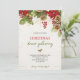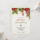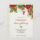Christmas dinner invitation card featuring festive red poinsettias, holly, and pinecones at the top, with elegant green and red script text below.