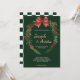 Elegant Christmas invitation with a wreath design on a dark green background featuring a red bow and festive elements. Back of the card: Blank with a textured white surface.