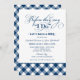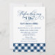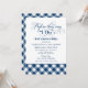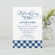 Um convite de janto de ensaio de casamento elegante e rústico para um evento casual de janto de ensaio de CHURRASCO do quintal apresenta estilizado "Antes que digam que eu faço, o Vamos tem um roteiro de CHURRASCO" e um design clássico de xadrez azul e branco de gingham. Personalize o texto personalizado do seu evento casual de churrasco no quintal.