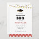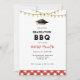 Convite divertido e rústico para churrasco de formatura com ilustração em aquarela de boina de formatura e luzes de corda com xadrez gingham vermelho e branco na parte inferior.