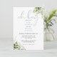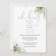Um convite de baby shower elegante e sofisticado com uma tipografia azul empoeirada e folhagem verde botânica. Desenhado por Thisisnotme©