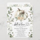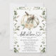 Um convite de chá de casal de outono elegante perfeito para celebrações outonais. Com um fundo branco chic, uma abóbora branca aquarela com brilho de ouro falso, flores brancas, eucalipto e outras folhagens botânicas. A frase doce e romântica 'Chuva de Amor' em caligrafia e um modelo de chá de casal que é fácil de personalizar.