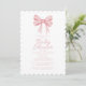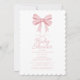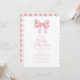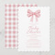 "Dê as boas-vindas à chegada de um precioso pequeno com o nosso convite de chá de bebê elegante em rosa pastel e branco. Adornado com um delicado laço rosa no topo, este design atemporal apresenta caligrafia e letras elegantes para apresentar os detalhes do evento. No verso, você encontrará um padrão xadrez rosa e branco coordenado.