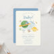 Tema de chuveiro de bebê elegante e moderno do espaço exterior da Galáxia, com design apresentando nave espacial aquarela, planetas verdes, satélite, telescópio, foguete com o texto "Houston, temos um bebê!" em azul, amarelo, verde. Você pode personalizar seu texto exclusivo. Este design é perfeito tanto para chuveiro de bebê de menino quanto de menina.