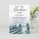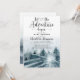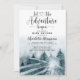 Convite de chuva de bebê com árvores florestais em aquarela e a frase: que a aventura comece de tema. Cores azul cinza suaves e etéreas. Nome em assinatura cursiva. Florestas em aquarela azul verde.