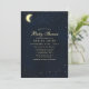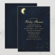 Convite de Chuva de Bebê Azul Meia-Noite Estrelas Lua Celestial. Este design apresenta luzes de estrelas cintilantes com uma lua crescente brilhante no céu noturno estrelado.