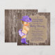 Adorável caubóiira roxa com chapéu de caubói roxo e botas de caubói roxas com aniagem em um fundo de madeira de celeiro rústico. Este convite de chuva de bebê caubóiira roxa rústica é facilmente personalizado para o seu evento, basta adicionar seus detalhes no estilo de letra e cor, texto e layout de sua escolha.