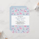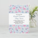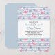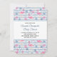 Convite de chuva de bebê com um padrão alegre e estival. Flamingos rosa e abacaxis postos sobre um padrão listrado azul claro com folhas e corações ao redor.