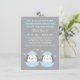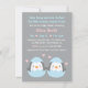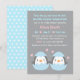 Duas vezes a alegria e duas vezes a diversão! Este convite de chuva de bebê fofo tem não um, mas dois pequenos pinguins bebês eclodindo de seus ovos. No verso há um padrão de bolinhas sobre um fundo azul. Um convite simples, porém adorável, usando cores azul pastel, rosa e cinza. Perfeito para futuras mães que esperam um par de meninos gêmeos! Personalize facilmente com os detalhes da sua chuva de bebê.