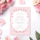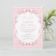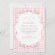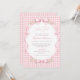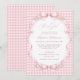 Celebre a chegada de uma doce menina com este encantador convite de chá de bebê em xadrez rosa. Com um fundo xadrez em rosa suave, tipografia elegante e laços de fita delicados com detalhes florais, este design cria um visual atemporal e feminino perfeito para um chá de bebê clássico ou inspirado em vintage.