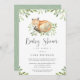Convites de chuva de bebê virtuais elegantes e inspirados na natureza apresentam uma raposa doce em aquarela enrolada em uma cama de folhas de eucalipto e folhagem verde. Personalize com os detalhes da sua chuva de bebê com tema florestal por correio abaixo, incluindo um endereço para enviar ou entregar presentes.