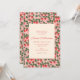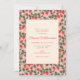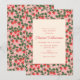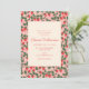 Este convite de chuva de bebê apresenta uma borda de videira de morango em vermelho, verde e branco em um fundo rosa suave ao redor de um painel central creme com o nome da futura mamãe em letra cursiva vermelha e todos os detalhes do evento.