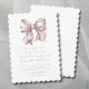 Este convite encantador para chá de bebê apresenta um laço cor-de-rosa claro com uma borda rendilhada para um toque extra de fofura. O design apresenta um visual simples e clássico de chá de bebê com texto cinza em uma mistura de tipografia serifada e caligráfica. Celebre a futura mamãe com estilo! Você pode personalizar as cores da fonte e as cores do fundo em ambos os lados. Ideal para chás de bebê durante todo o ano, especialmente para uma festa no jardim ou brunch. Fácil de decorar com laços e fitas cor-de-rosa ou outros temas. Convite de Chá de Bebê com Laço Rosa em Aquarela com Tipografia Elegante.