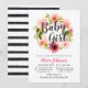 Este convite de chuva de bebê encantador apresenta um texto em negrito "Bebê Menina" aninhado dentro de uma exuberante coroa floral em aquarela de tons rosa, pêssego e flores de dália e rosa pastéis com folhagem verde fresca. O texto macio preto e rosa brilhante pode ser totalmente personalizado para a sua celebração. Listras horizontais pretas e ousadas enfeitam o verso deste cartão elegante de dois lados. Uma escolha perfeita para uma chuva de bebê de menina moderna.