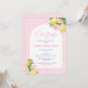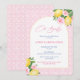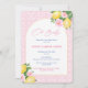 Este convite de chuveiro de bebê moderno apresenta um design de arco em tendência e limões, com destaques florais rosa contra um fundo impresso rosa e branco feito a partir de um azulejo vintage.