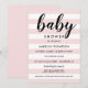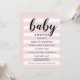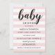 Este convite de chuva de bebê chic e moderno apresenta um texto "bebê" em letra cursiva ousada, combinado com listras horizontais rosa claro e branco para um visual suave e feminino perfeito para a celebração de uma menina. O texto escuro fornece um contraste nítido em todo o design. O padrão de listras gráficas simples mantém o foco diretamente nos detalhes do seu evento. Todo o texto é totalmente personalizável para a sua celebração.