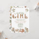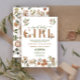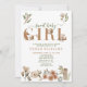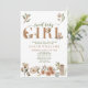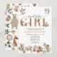 Crie o anúncio de bebê perfeito para menina + convite para chá de bebê com este tema moderno de animais da floresta boho "Doce Bebê Menina" design de tipografia citação, apresentando raposa pintada à mão, esquilo e animais ouriço-cacheiro decorando a palavra 'bebê'. O verso do cartão apresenta uma ilustração com tema de animais da floresta. Copyright Elegant Invites, todos os direitos reservados.