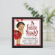 Convite de chuva de bebê joaninha com adorável menina étnica bebê vestindo um lindo traje de joaninha vermelha e preta em um lindo fundo vermelho e preto com texto de joaninha. Você pode personalizar facilmente este adorável convite de chuva de bebê joaninha vermelha e preta para o seu evento, simplesmente adicionando seus detalhes no estilo de fonte e cor que preferir.