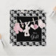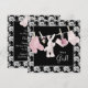 Convite de chuva de bebê menina rosa e preto com adorable botinhas cor-de-rosa, chupeta, botinhas e coelho pendurados em uma corda de roupa. Você pode personalizar facilmente este convite de chuva de bebê rosa e preto adicionando os detalhes do seu evento, estilo de letra, tamanho e cor da fonte e texto.
