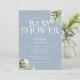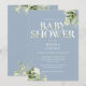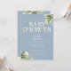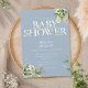 Um convite de chá de bebê elegante com tipografia elegante e bela folhagem botânica em um fundo azul poeirento. Criado por Thisisnotme©