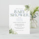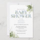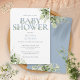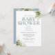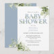 Um convite de chá de bebê elegante com uma tipografia azul empoeirada elegante e folhagem verde botânica bonita. Criado por Thisisnotme©