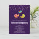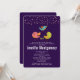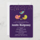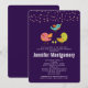 Um convite de chuva de bebê com um trio de pássaros fofos e caprichosos desenhados à mão. 2 dos pássaros estão de pé juntos com algumas pequenas árvores de pinheiro verdes entre os pés. Outro pássaro azul está voando no ar entre eles. Confetes falsos em dourado rosa no topo. Definido em um fundo roxo.