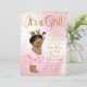 Convite de chuveiro de bebê princesa africana por correio com adorável bebê princesa usando um tutu rosa franzido e coroa dourada com uma corda de pérolas em um belo fundo rosa e dourado. Este convite de chuveiro de bebê por correio rosa e dourado é facilmente personalizado para o seu evento, adicionando seus detalhes no estilo de letra, cor e redação de sua escolha.