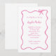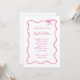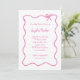 Este convite de chuva de bebê estilo coquete chic e elegante apresenta uma moldura ilustrada ondulada desenhada à mão em rosa com um laço, e uma fonte manuscrita estilosa em um fundo branco simples para uma chuva de bebê de menina com estilo parisiense ou francês.