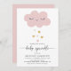 Convites de chuva de bebê fofos com uma nuvem de desenho animado rosa poeira com confeites em forma de coração rosa e dourado. "Chuva de Bebê" é exibido em caligrafia moderna com os detalhes do seu evento de chuva de bebê mostrados abaixo.
