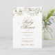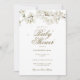 Convite de chuveiro de bebê elegante e neutro em relação ao gênero, com flor de branca bonita, apresentando delicada moldura de flores da primavera detalhando seu chuveiro de bebê em letras douradas elegantes. Personalize com os detalhes do seu evento especial. O verso apresenta pétalas de flor branca espalhadas. Criado por Thisisnotme©