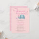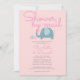 Um convite encantador com elefantes pais e bebês fofos com corações e detalhes personalizados de chá de bebê à distância, chuva de bênçãos ou chá de casal pelo correio em um fundo rosa bebê. O verso tem um padrão de bolinhas rosa em um fundo rosa bebê. Criado por Thisisnotme©
