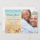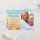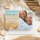 Convites de chuva de casamento de casais de destino de casamento na praia tropical com um fundo rústico ombre de amarelo a azul aquarela, estrela-do-mar, conchas, luzes de corda, dois corações na areia com suas iniciais, uma foto do casal e um modelo de chuva de casamento de casais elegante que é fácil de personalizar.