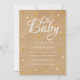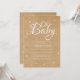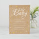 Lindos corações dourados estão espalhados em torno dos seus detalhes personalizados em texto branco sobre um fundo de papel kraft rústico boho com corações dourados extras espalhados no verso deste convite de baby shower chic neutro em gênero, sprinkle ou chá de casal. Concebido por Thisisnotme