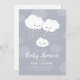 Personalize este Convite de Chá de Bebê de Casais Moderno e Elegante com uma família de nuvens fofas, composta por três nuvens brancas: pai, mãe e uma bebê, onde os orgulhosos pais nuvens estão banhando seu bebê com uma chuva de corações cor-de-rosa em um céu cinza quente.