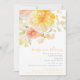 Um convite de baby shower de verão com flores em aquarela em amarelo e rosa claro. O título "bebê em flor" está em fonte estilo escrita à mão em amarelo e detalhes em fonte serifada cinza e amarela.