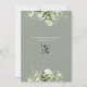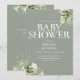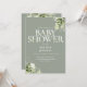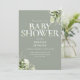 Um convite de chá de bebê elegante com tipografia sofisticada e folhagem botânica em verde oliva neutro ao sexo no fundo e seu código QR no verso. Criado por Thisisnotme©