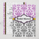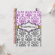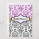 Convite de casamento de damasco preto branco roxo amarelo para chuva de noiva. A parte superior é de padrão de damasco roxo e branco e a parte inferior é de preto e branco. Uma faixa amarela separa as duas partes. Seu texto é digitado em um rótulo elegante com contorno branco e roxo.