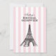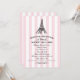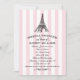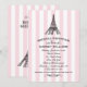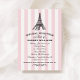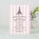 Um convite de casamento com tema Paris deslumbrante, apresentando uma Torre Eiffel ilustrada no topo de faixas de toldo rosa e branco. A escrita em caligrafia e os floreios ornamentados em preto criam uma estética romântica de café francês. Uma escolha linda para uma celebração com tema Paris ou viagem. Todo o texto é totalmente editável.