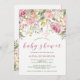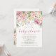 Convites de chá de bebê encantadores apresentam um design floral rosa e dourado falso com muitas folhas botânicas verdes da moda. A tipografia rosa moderna adiciona ainda mais estilo elegante. Usamos arte de LABFcreations.