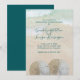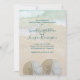 Convites de chá de panela ou festa de noivado com fundo de praia e desenho de dois dólares de areia. Personalize o texto em três locais com nomes em fonte de letra maior. Todo o texto é azul-esverdeado e o fundo é água do mar azul clara e areia da praia. Dois grandes dólares de areia com furo de fechadura, em seu estado natural, representam o casal que ama a praia e espiam do fundo do cartão.