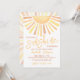 Celebre a chegada iminente com este convite de chá de bebê ensolarado, brilhante e alegre. No topo, um grande sol com raios vibrantes em tons de amarelo, laranja e vermelho define o tom para uma celebração alegre. A frase "Um pequeno raio de sol está a caminho!" é exibida em uma mistura divertida de fontes modernas e tipografia em negrito. A parte inferior do convite inclui todos os detalhes do evento, estilizados em uma combinação de estilos de fonte e cores quentes inspiradas no sol - amarelo, laranja e vermelho - para combinar com os raios do sol.