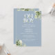 Convite de baby shower oh boy com código QR do seu registro e todos os detalhes da festa de bebê em tipografia elegante e folhagem botânica em verde em um fundo azul poeirento. Projetado por Thisisnotme©