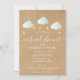 Tome um banho virtual quando você não puder estar junto. Com nuvens verdes menta fofas e estrelas douradas em cordas, em um fundo rústico neutro kraft boho, este convite de chá de bebê virtual online neutro em relação ao gênero, sprinkle ou chá de casal é perfeito para todos os pequenos que estão a caminho. Adicione os detalhes da sua celebração em texto elegante para criar o convite perfeito. Criado por Thisisnotme©