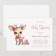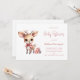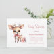 Convite de chá de bebê com uma ilustração de um adorável bebê veado. Olhos grandes orelhas grandes com uma cabeça grande e pequenos chifres marrons. Usando um grande laço vermelho. De pé ao lado de uma pilha de presentes.