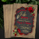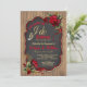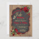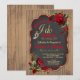 Convite de festa de noivado com churrasco com rosas vermelhas e fitas e elegante escrita Eu aceito com alianças de casamento em um fundo de madeira rústica. Você pode personalizar facilmente este convite de churrasco Eu aceito de madeira rústica para o seu evento simplesmente adicionando seus detalhes.