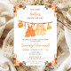 Este convite de chuveiro de bebê aquarela fofo e caprichoso apresenta uma linha de roupas de bebê com arranjos florais laranja. O texto combina fontes manuscritas e sem serifa para um visual elegante e moderno. Isso é perfeito para um chuveiro de bebê de outono.