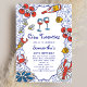 Set against a classic Mediterranean blue tiles background with a squiggle doodle frame, this charming design is perfect for hosting a seafood dinner party, wine night, or girls' night out in celebration of her milestone birthday.