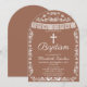 Honre o batizado do seu filho com este lindo convite de batismo em forma de arco inspirado no México! Com uma cruz branca elegante, uma graciosa escrita "Batismo", uma faixa de papel picado branco, uma borda florida de arte popular intrincada e dois passarinhos na parte inferior — tudo emoldurado em um arco moderno sobre um fundo marrom terracota quente. Um design terno e significativo que combina perfeitamente o estilo contemporâneo com a herança cultural latina tradicional.