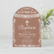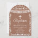 Honor your little one's baptism with this beautiful arch-shaped Mexican-inspired baptism invitation! Featuring an elegant white cross, graceful "Baptism" script, a white papel picado banner, intricate folk art floral border, and two lovebirds at the bottom — all framed in a modern arch shape on a warm terracotta brown background. A tender and meaningful design that perfectly blends contemporary style with traditional Latin cultural heritage.