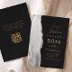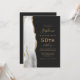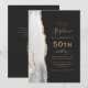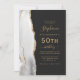 A borda esquerda deste convite de festa de aniversário de 50 anos moderno e elegante apresenta uma borda de ágata em aquarela cinza e branca aparada com brilho falso dourado. O texto personalizável combina escrita à mão em cor dourada, fontes copperplate e itálico em um fundo preto ardósia. Adicione instruções de RSVP no verso do cartão, juntamente com um código QR que os convidados podem digitalizar para responder online.